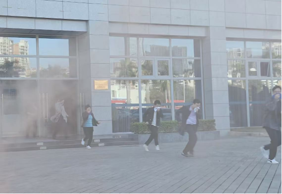 “報告!三樓發現火災警報!”按照演練方案,工作人員在市水務調度中心三樓“發現”火情,并按下消防報警按鈕。隨后消防控制室工作人員向演練指揮組長報告火情,啟動市水務調度中心大樓消防應急預案。消防控制室立即拉響大樓消防警報,滅火消防小組火速趕往起火點進行滅火。與此同時,在濃烈的煙霧和刺耳的警報聲中,各樓層員工迅速從樓梯有序疏散至一樓空曠地方。