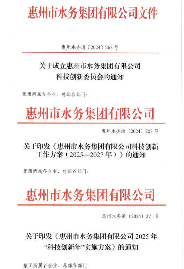 發布科創工作方案:頒發《惠州市水務集團有限公司科技創新工作方案(2025—2027年)》,明確未來三年的科技創新目標和實施路徑。制定《惠州市水務集團有限公司2025年“科技創新年”實施方案》,有力夯實集團的科技創新基礎。