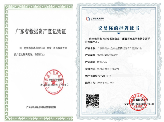 數據要素取得突破:首款供水數據產品成功通過廣州數據交易所審核,榮獲數據資產登記憑證,標志著市供水公司成為廣東省首家完成數據產品掛牌交易的供水企業。此外,該產品也順利完成了數據資產財務入表工作,成為惠州市國資系統第一家利用企業自有數據完成數據要素入表的國有企業。